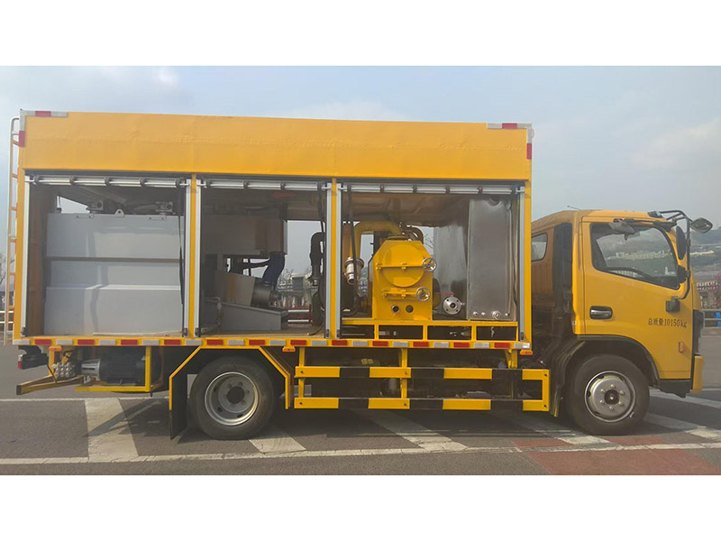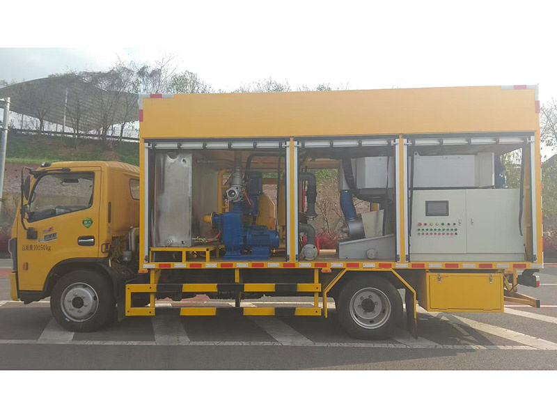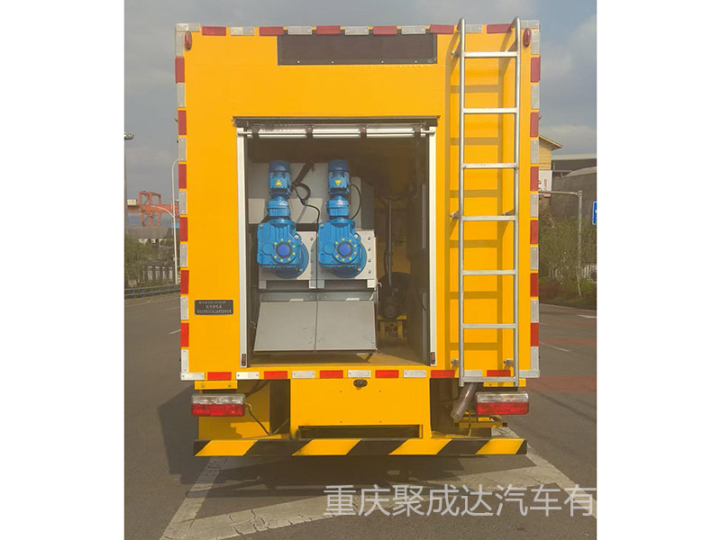 GHW5100TWJDF吸污净化车主要用于化粪池清掏、雨水排涝、污泥脱水、管道疏通的专项作业。整车主要由底盘、真空吸污系统和干湿分离系统及污泥脱水净化系统、电器自动控制系统、高压疏通系统等组成。底盘为单排座,国六排放标准。通过真空吸污系统将污物从化粪池等容污池内吸出进入干湿分离系统进行污水和固体污物分离 ,分离后的污水直接排出(连吸连排)或再进入污泥脱水净化系统(净化处理)。污泥脱水净化系统将污水与药水混合絮凝后通过叠螺机进行污泥脱水,脱水后的污泥可作有机肥利用,脱水后的水质清澈透明、无臭味,对环境无污染、对管网无堵塞。
